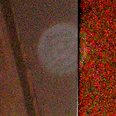 This is what I found. See the patterns of the orb extend to the right. This was at first not visible in the brightness of the door jam. But when you darken it, it becomes obvious. So that tells me whatever the object is, is closer to the camera than the location of the door jam.