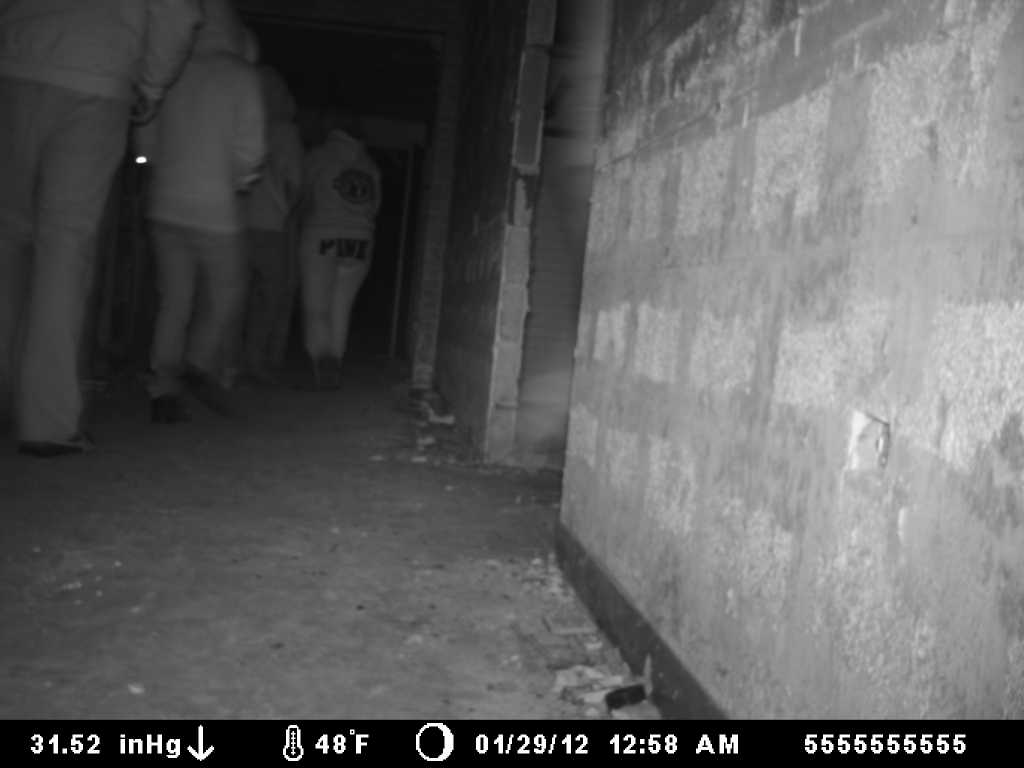 This is the last pic our of a series of 3 that were snapped at 1 second intervals. We tripped the cam, but the last photo caught this see through glowing apparition walking into a room right behind us. All of our investigators are present in the photo, plus 1 extra!
