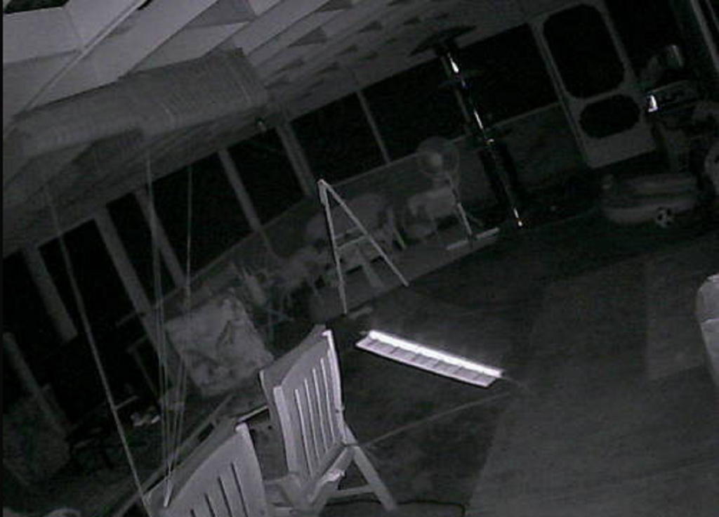 Those are bamboo blinds. There are three of them. All are rolled up and the lines are drawn together and held behind the chair on the left. There was nothing in that area. Unless of course a rope came loose, moved to the right and then went back to where it was.