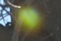 Well I went round and round about this one. When I did a luminance curve on it and brought out the detail it almost started to look like a green leaf. But that really doesn't fit, I doubt you would see a green leaf there. And the reason for its blurry appearance is because it was out of focus. The camera is focusing on the tree and so it has a fairly distant focal length. The green object is much more in the forefront so its blurry.