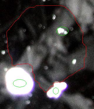 Now lets look a bit deeper, look at the snow flakes in the area of the image. The snow flakes in the "Face" area are darker. If you look at the color density you can see that the whites of the snow flakes are 245/245/248 in the face area, versus the 255/255/252 of all the other snowflakes. The snowflakes are in the forefront, so they should be roughly the same average brightness for comparable sized flakes anywhere in the picture. But in that one area, they are not. That usually indicates some image was superimposed over the top.