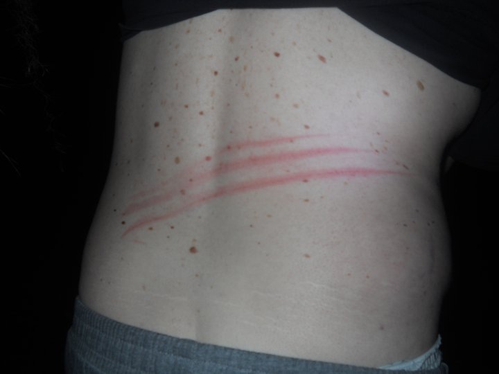 this pic was taken at montrose cemtary while there investagating some people showed up wanted to take a pic with one of our investagtors if you look right over the top of the young mans hand you can see a orb that if you zoom in looks like a form of a face the second pic is of an investagator that was scratched that night